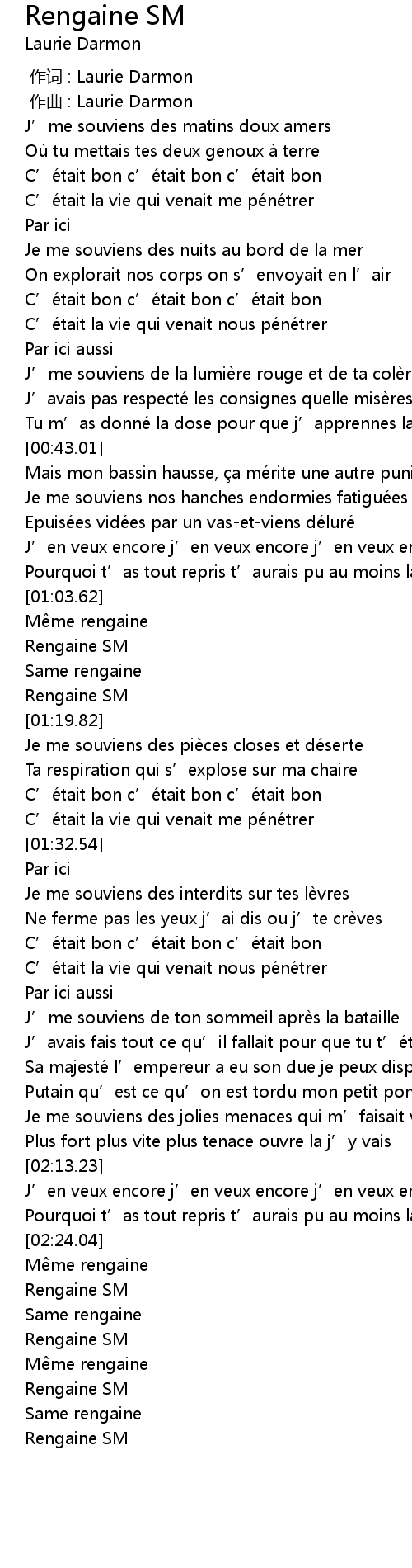 | [02:20.66] | Pourquoi t’as tout repris t’aurais pu au moins laisser ton corps |