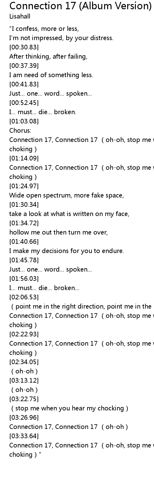 | [03:37.83] | Connection 17, Connection 17 (oh-oh, stop me when you hear me choking)" |