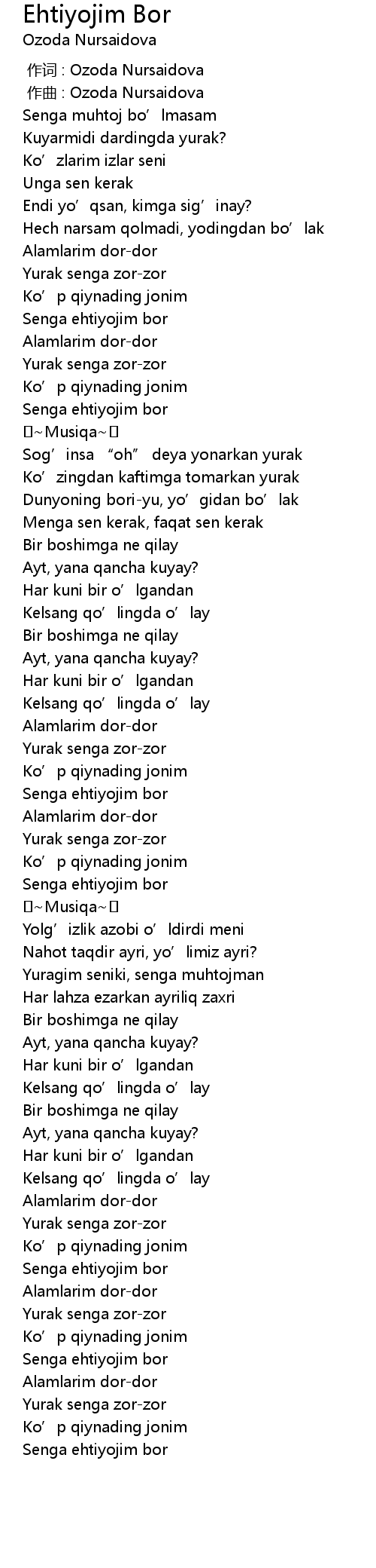 | [00:00.000] | 作词 : Ozoda Nursaidova |