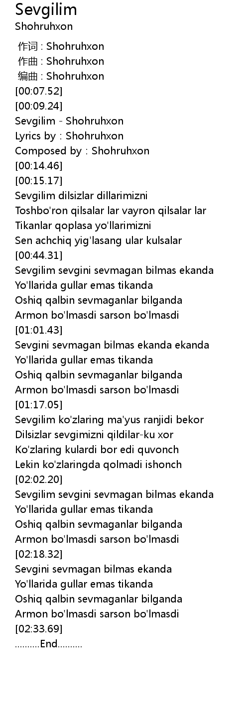 | [00:11.17] | Sevgilim - Shohruhxon |