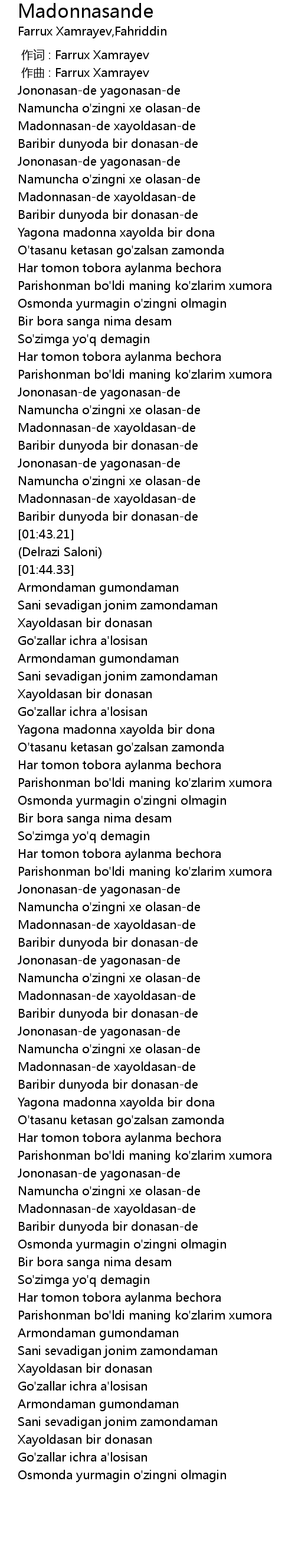 | [00:00.000] | 作词 : Farrux Xamrayev |