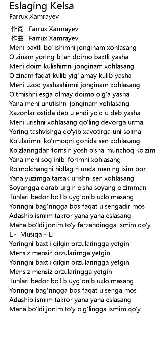 | [00:00.000] | 作词 : Farrux Xamrayev |
