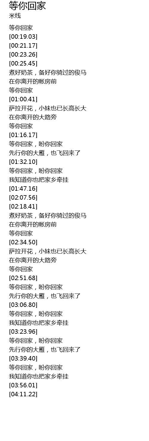 | [03:24.94] | 等你回家,盼你回家 |