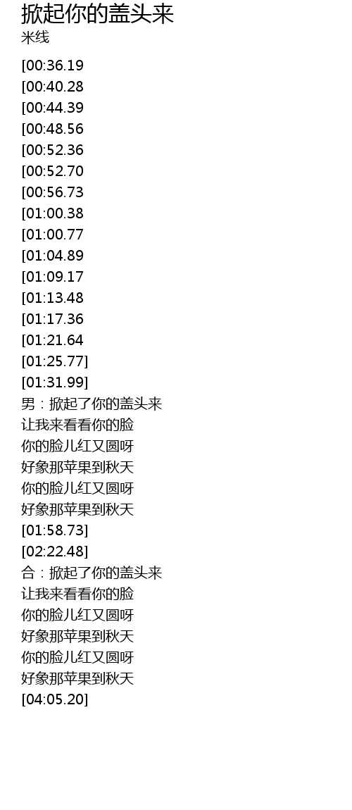 | [03:13.42][01:00.77] | 女:掀起了你的盖头来 |