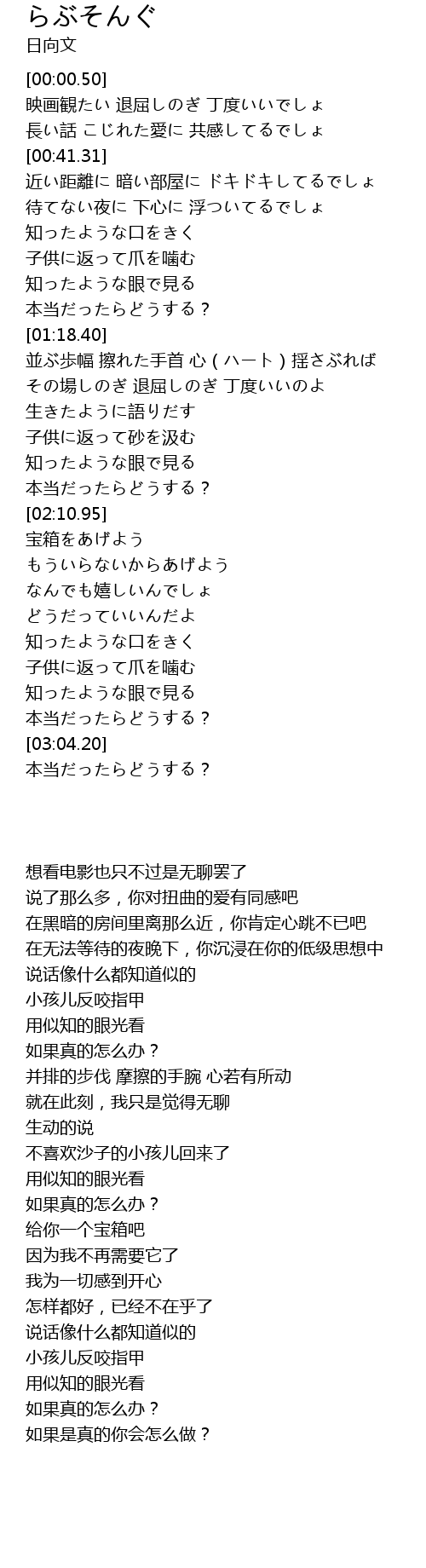 | [00:25.82] | 長い話 こじれた愛に 共感してるでしょ |