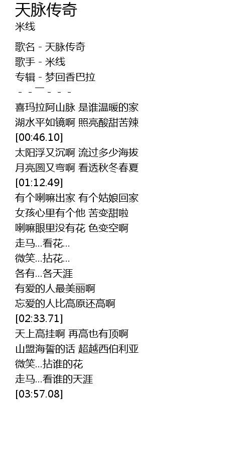 | [00:00.45] | 歌名-天脉传奇 |