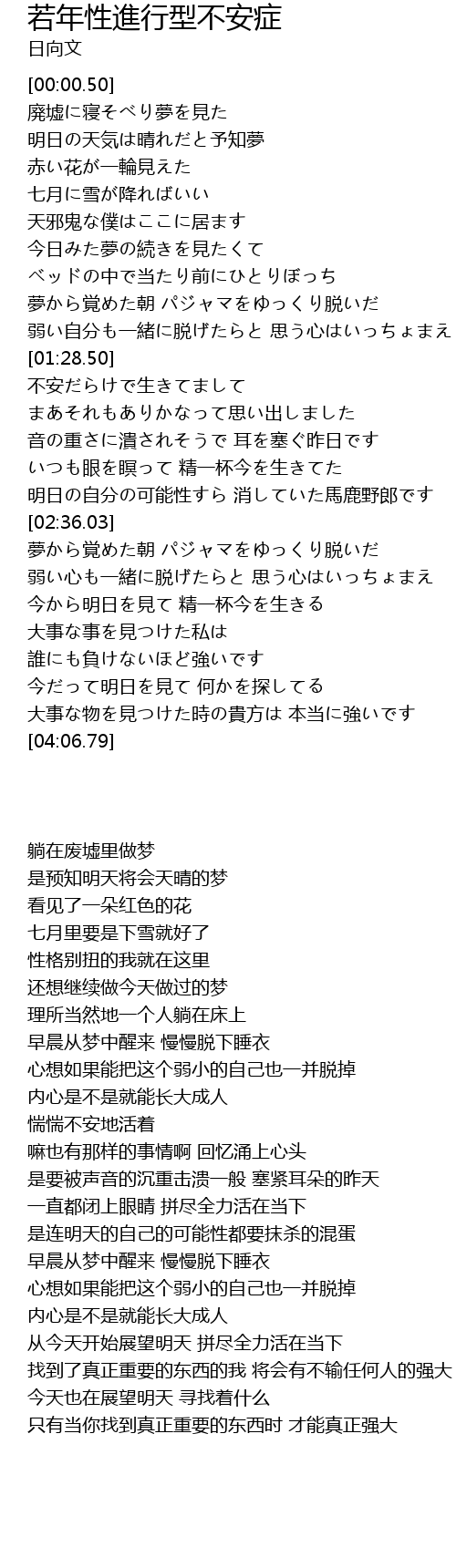 | [00:22.43] | 廃墟に寝そべり夢を見た |