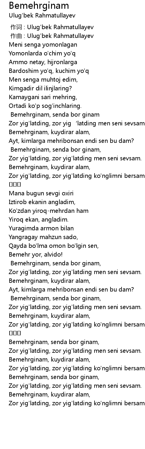 | [02:34.53] | Zor yig' latding, zor yig' latding men seni sevsam. |