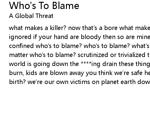 what makes a killer? now that's a bore what makes you scream? you're being ignored if your hand are bloody then so are mine we all want freedom when we're confined who's to blame? who's to blame? what's the ****ing difference does it matter who's to blame? scrutinized or trivialized the end result's the same the world is going down the ****ing drain these things happen every day buildings burn, kids are blown away you think we're safe here (america) privileged from birth? we're our own victims on planet earth down the ****ing drain |
