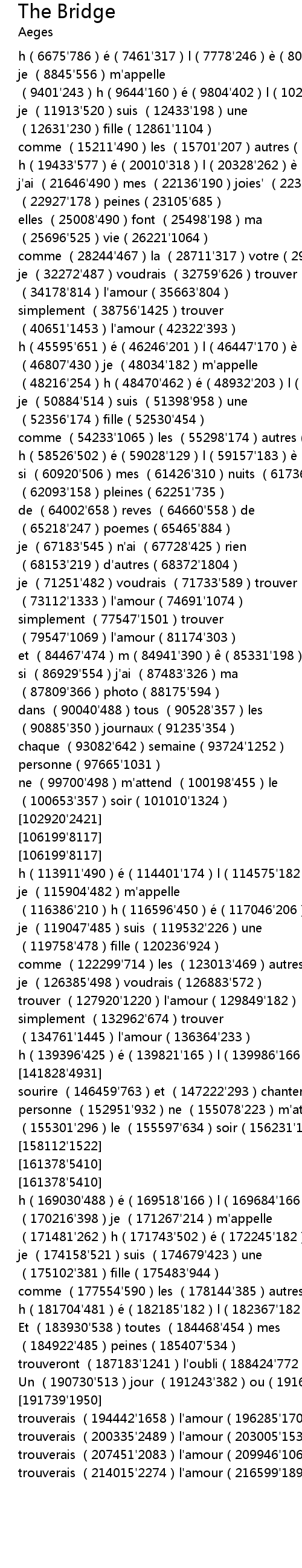 | [21646'2145] | j'ai (21646'490)mes (22136'190)joies' (22326'601)mes (22927'178)peines(23105'685) |