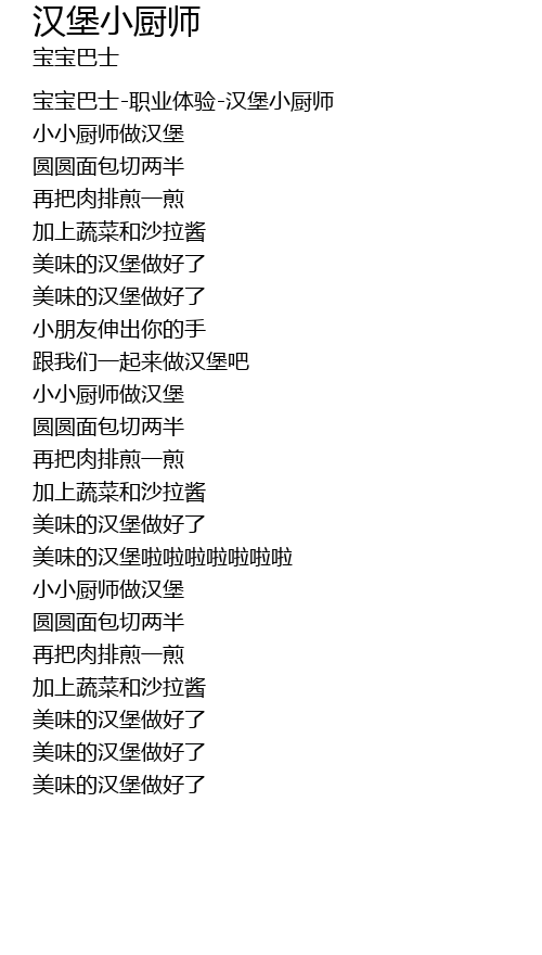 | [00:01.547] | 宝宝巴士-职业体验-汉堡小厨师 |