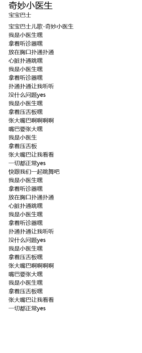 | [00:01.60] | 宝宝巴士儿歌-奇妙小医生 |