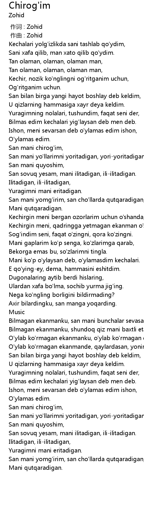 | [01:34.95] | Sog' indim seni, faqat o' zingni, qora ko' zingni. |