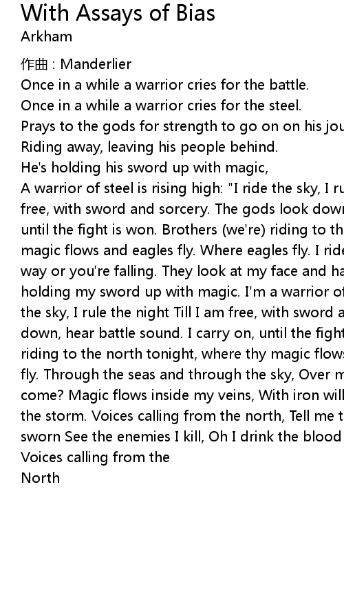| A warrior of steel is rising high: "I ride the sky, I rule the night Till I am free, with sword and sorcery. The gods look down, hear battle sound. I carry on, until the fight is won. Brothers (we're) riding to the north tonight, where thy magic flows and eagles fly. Where eagles fly. I ride proud and wild, out of my way or you're falling. They look at my face and hail me when I'm passing by. I'm holding my sword up with magic. I'm a warrior of steel I'm rising high. I ride the sky, I rule the night Till I am free, with sword and sorcery. The gods look down, hear battle sound. I carry on, until the fight is won. Brothers, (we're) riding to the north tonight, where thy magic flows and eagles fly. Where eagles fly. Through the seas and through the sky, Over mountains oh so high. What shall come? Magic flows inside my veins, With iron will I'll break the chains. Face the storm. Voices calling from the north, Tell me to fulfil the oath I have sworn See the enemies I kill, Oh I drink the blood I spill to stay strong." | |