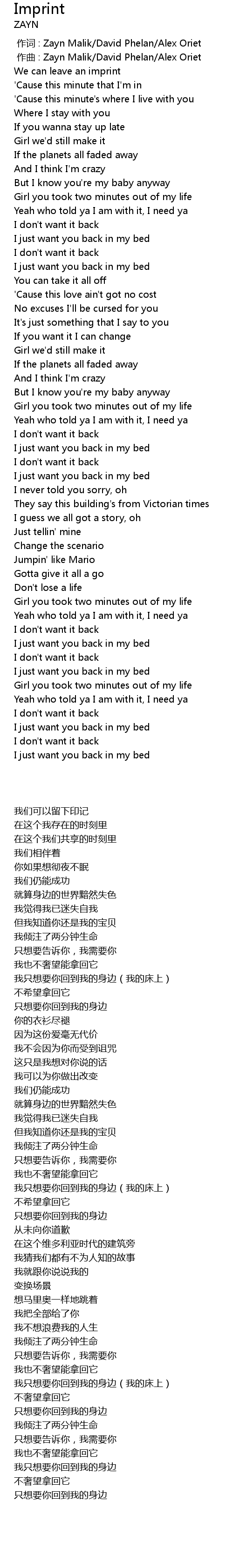 | [00:00.000] | 作词 : Zayn Malik/David Phelan/Alex Oriet |
