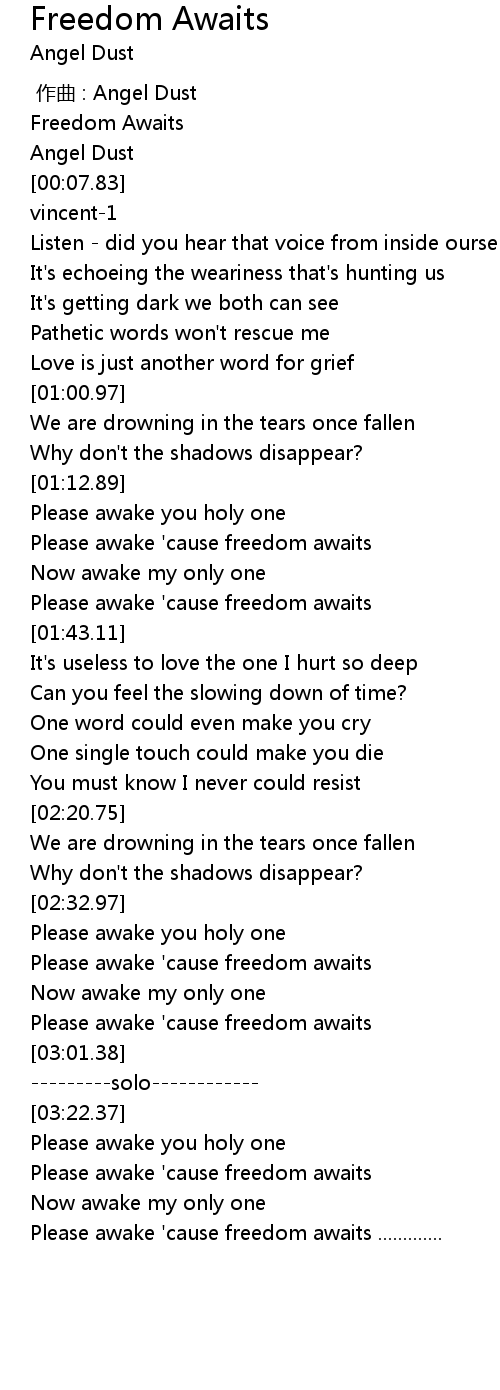 | [02:53.60] | Please awake ' cause freedom awaits |
