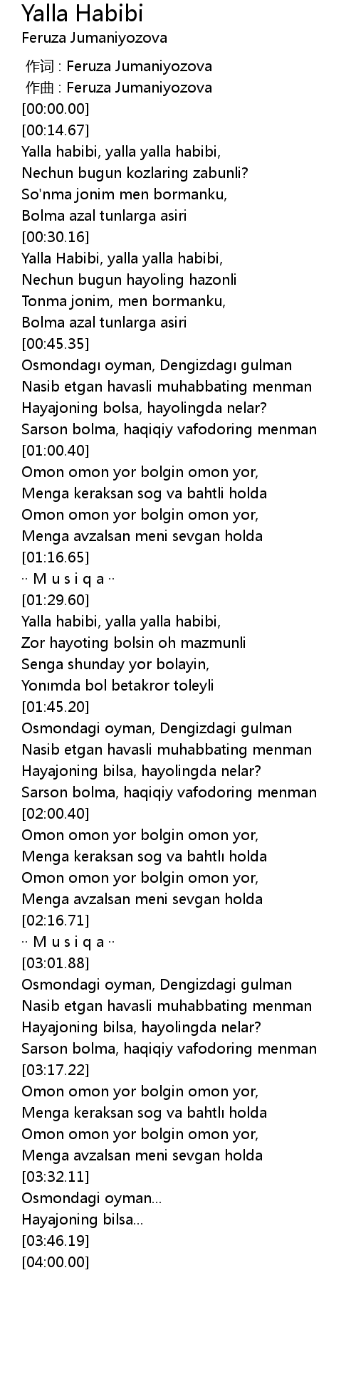 | [00:00.000] | zuo qu : Feruza Jumaniyozova |