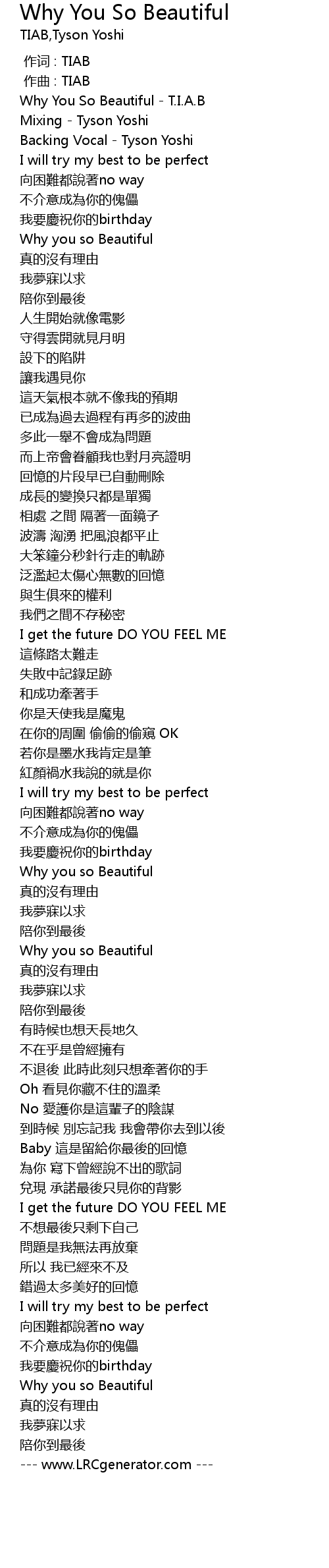| [00:00.73] | Why You So Beautiful T. I. A. B |