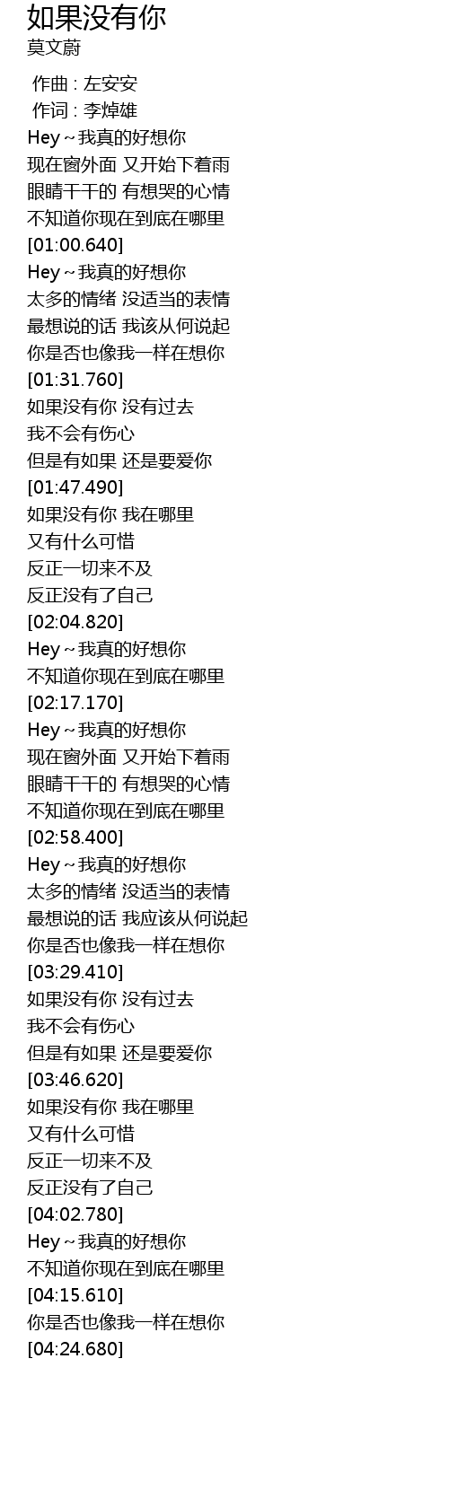 | [01:04.690] | Hey wǒ zhēn de hǎo xiǎng nǐ |