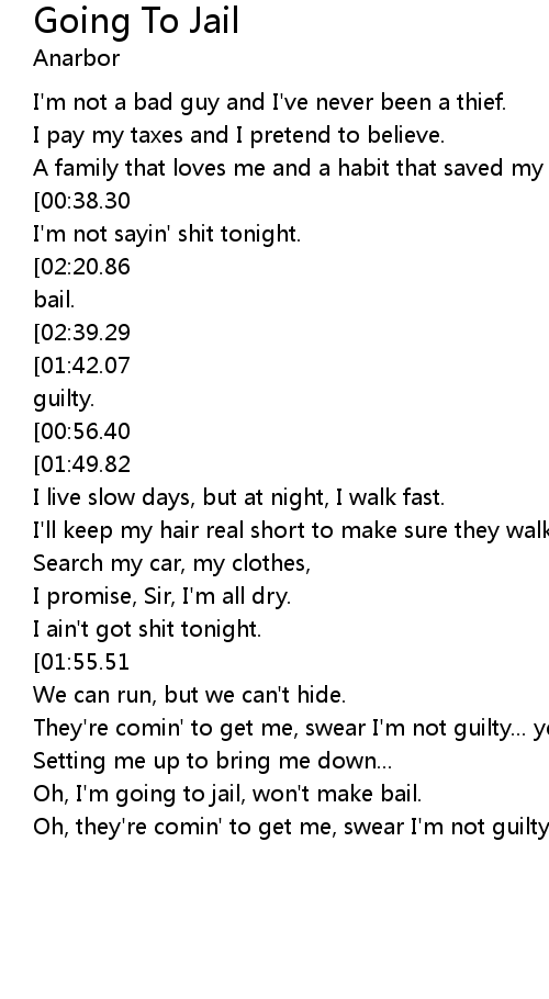| [02:35.50][02:20.86][01:35.41][00:45.35] | Oh, I'm going to jail, I won't make bail. |