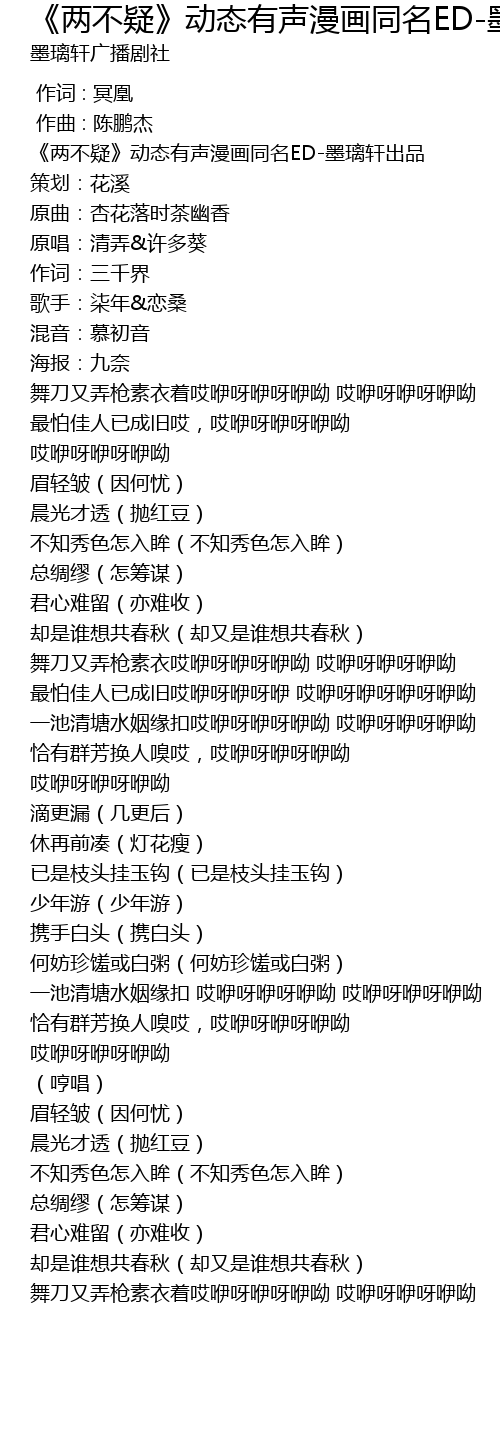 | [00:09.358] | 《两不疑》动态有声漫画同名ED-墨璃轩出品 |