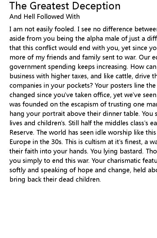 I am not easily fooled. I see no difference between you and all the others, aside from you being the alpha male of just a different pack of wolves. You said that this conflict would end with you, yet since you've come to be, I've seen more of my friends and family sent to war. Our economy has worsened, yet government spending keeps increasing. How can a capitalist nation punish small business with higher taxes, and like cattle, drive their business to the companies in your pockets? Your posters line the streets like something's changed since you've taken office, yet we've seen no difference. This country was founded on the escapism of trusting one man, yet now I see entire familes hang your portrait above their dinner table. You swore you would better all our lives and children's. Still half the middles class's earning go to the Federal Reserve. The world has seen idle worship like this before, in Nazi-occupied Europe in the 30s. This is cultism at it's finest, a wave of nations putting all their faith into your hands. You lying bastard. Those many suffering supported you simply to end this war. Your charismatic features on TV screens smiling softly and speaking of hope and change, held above their heads like a promise to bring back their dead children. |
