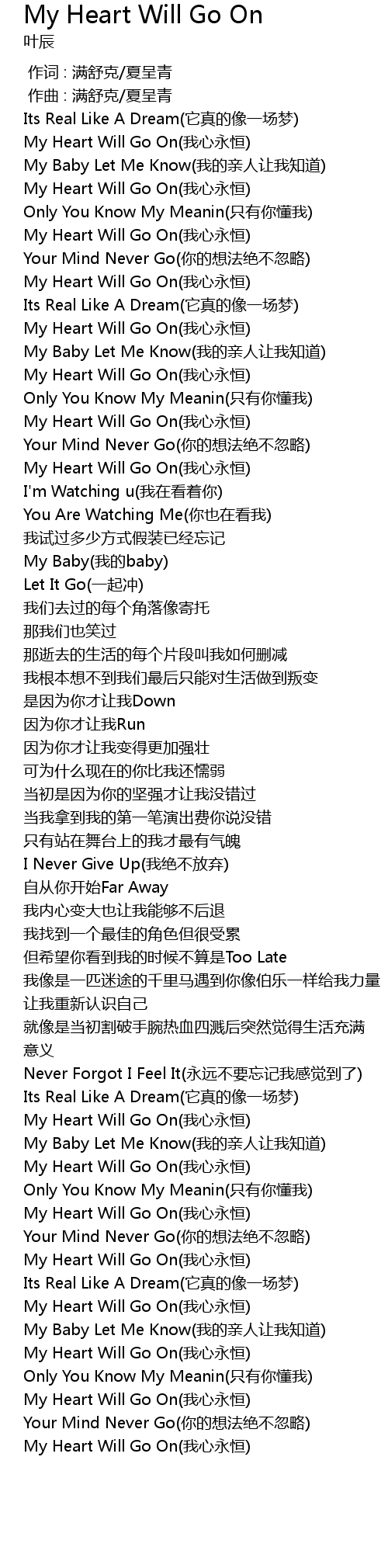 | [00:06.46] | My Heart Will Go On wǒ xīn yǒng héng |