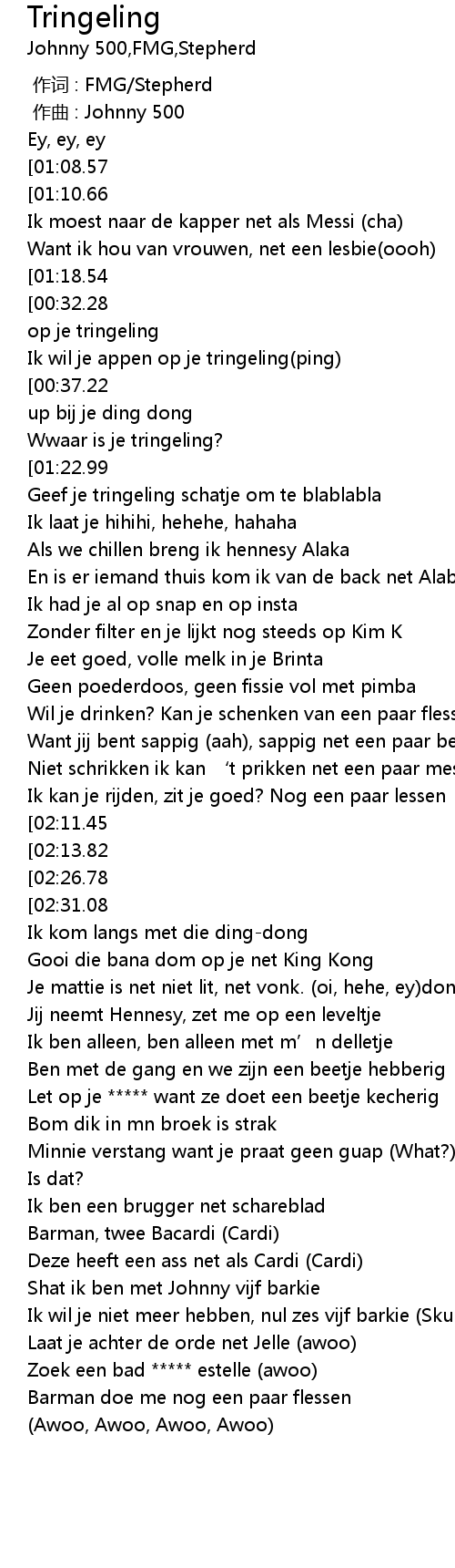 | [00:34.73][01:22.99][02:21.23] | Ik wil je appen op je tringeling (ping) |