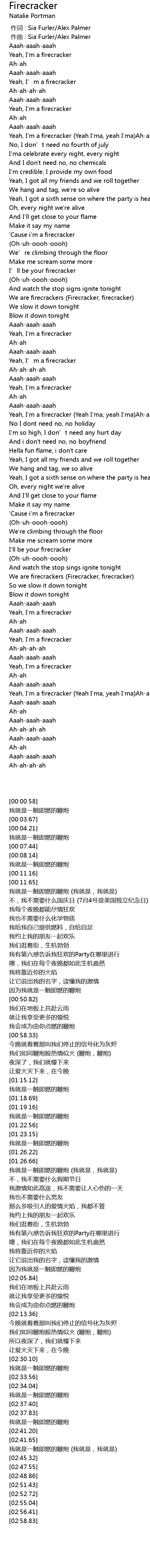 | [02:43.58] | Yeah, I' m a firecracker Yeah I' ma, yeah I' ma Ahahahah |