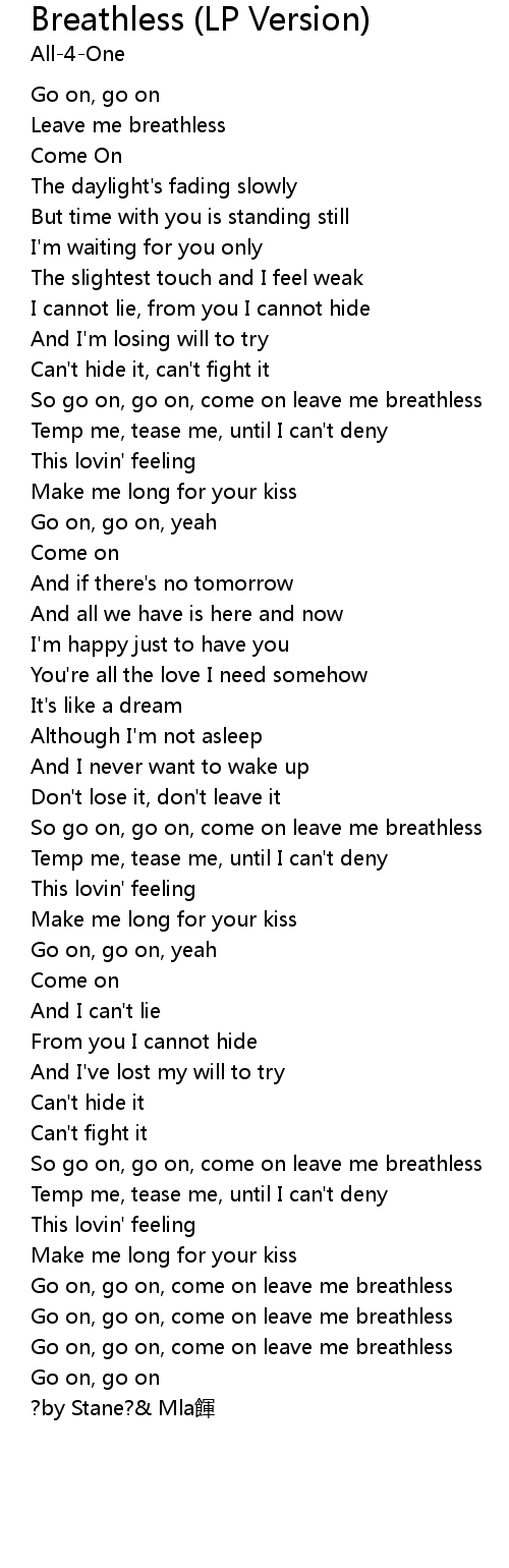 | [03:15.00] | Go on, go on, come on leave me breathless |