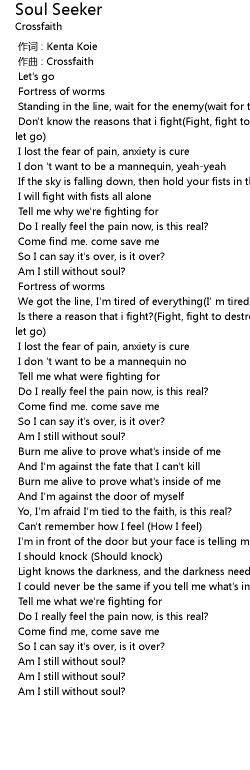 | [01:35.12] | Is there a reason that i fight? Fight, fight to destroy them, just let go |