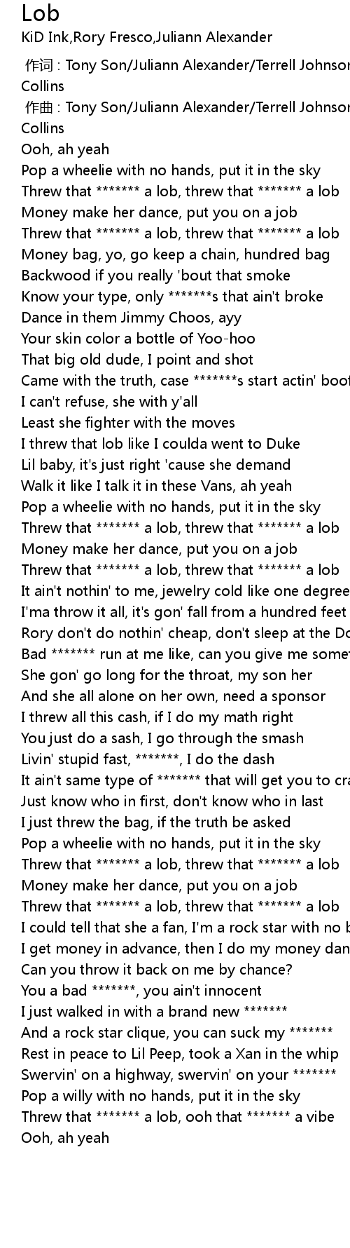 | [00:18.60] | Threw that ******* a lob, threw that ******* a lob |