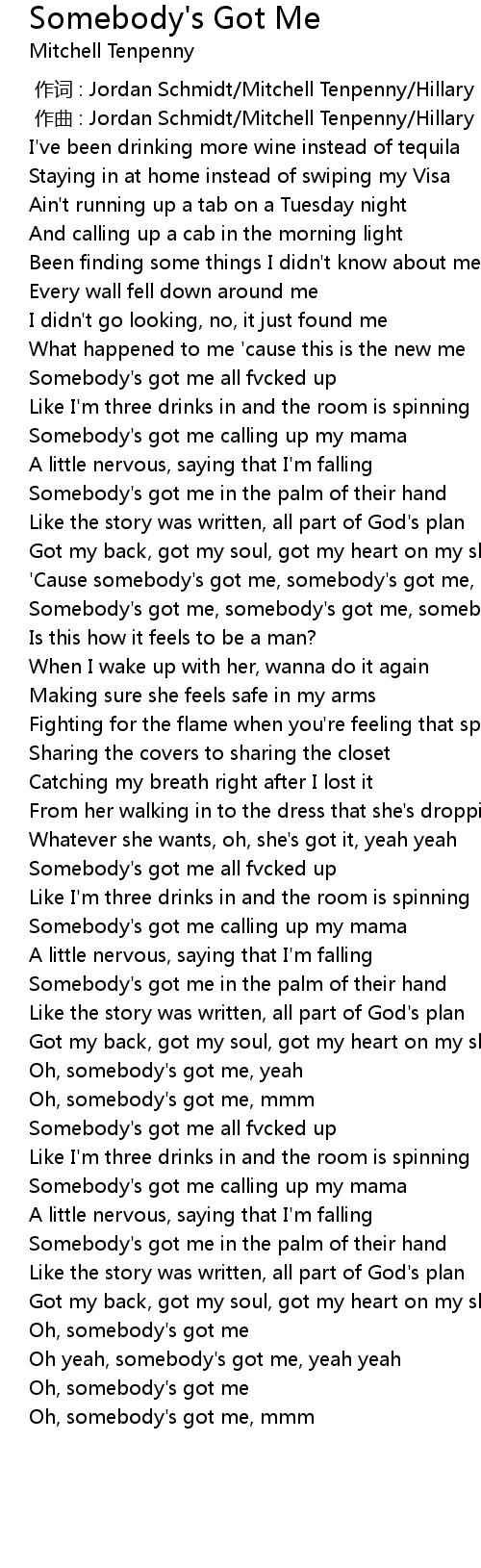 | [01:04.435] | ' Cause somebody' s got me, somebody' s got me, somebody' s got me |