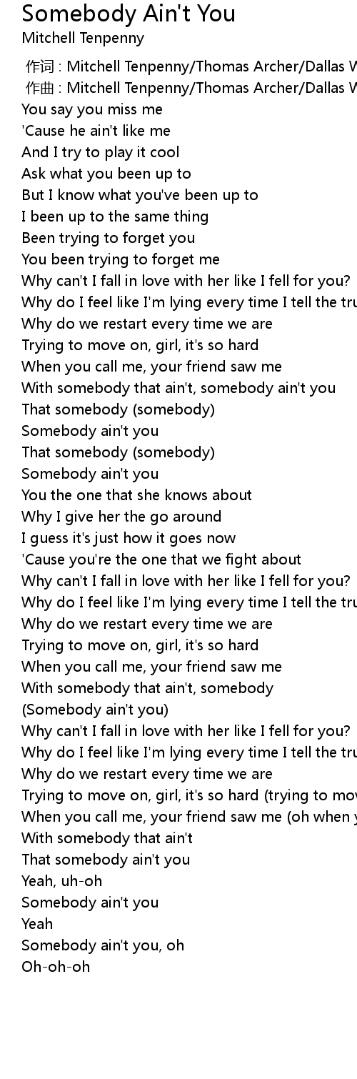 | [00:57.977] | With somebody that ain' t, somebody ain' t you |
