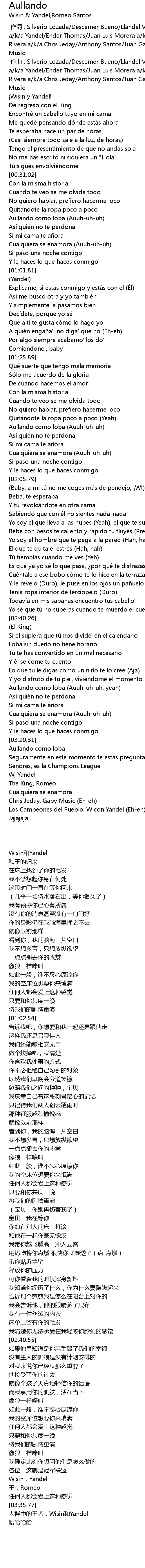 | [00:00.000] | zuo ci : Silverio Lozada Descemer Bueno Llandel Veguilla Malave a k a Yandel Ender Thomas Juan Luis Morera a k a Wisin Carlos Enrique Ortiz Rivera a k a Chris Jeday Anthony Santos Juan Gabriel Rivera Va zquez a k a Gaby Music |