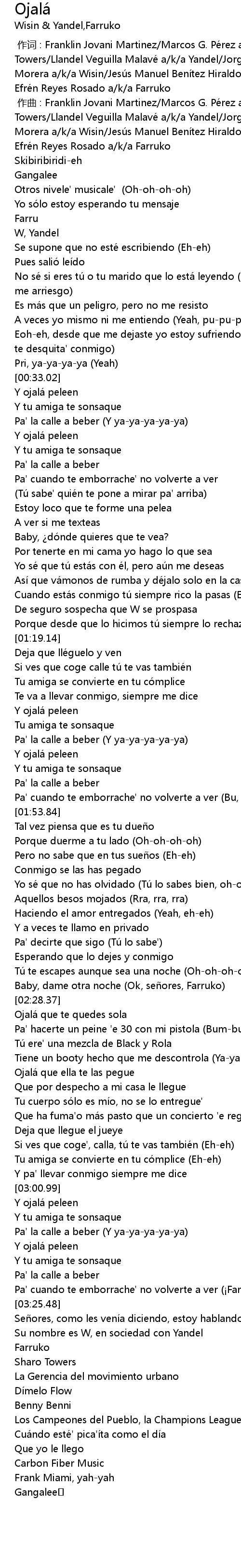 | [00:00.537] | zuò qǔ : Franklin Jovani Martinez Marcos G. Pé rez a k a Sharo Towers Llandel Veguilla Malavé a k a Yandel Jorge Valdé s a k a Flow Juan Luis Morera a k a Wisin Jesú s Manuel Bení tez Hiraldo a k a Benni Benni Carlos Efré n Reyes Rosado a k a Farruko |