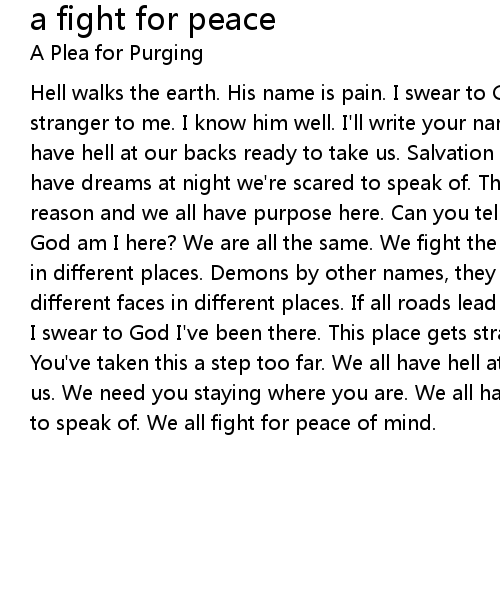 Hell walks the earth. His name is pain. I swear to God I've seen him. He's no stranger to me. I know him well. I'll write your name into the stars. We all have hell at our backs ready to take us. Salvation for these many scars. We all have dreams at night we're scared to speak of. They say everything happens for a reason and we all have purpose here. Can you tell me what this all means and why God am I here? We are all the same. We fight the same fight with different faces in different places. Demons by other names, they haunt us at night with different faces in different places. If all roads lead home, then home is pain. I swear to God I've been there. This place gets stranger by day. Am I in hell? You've taken this a step too far. We all have hell at our backs ready to take us. We need you staying where you are. We all have dreams at night we're scared to speak of. We all fight for peace of mind. |