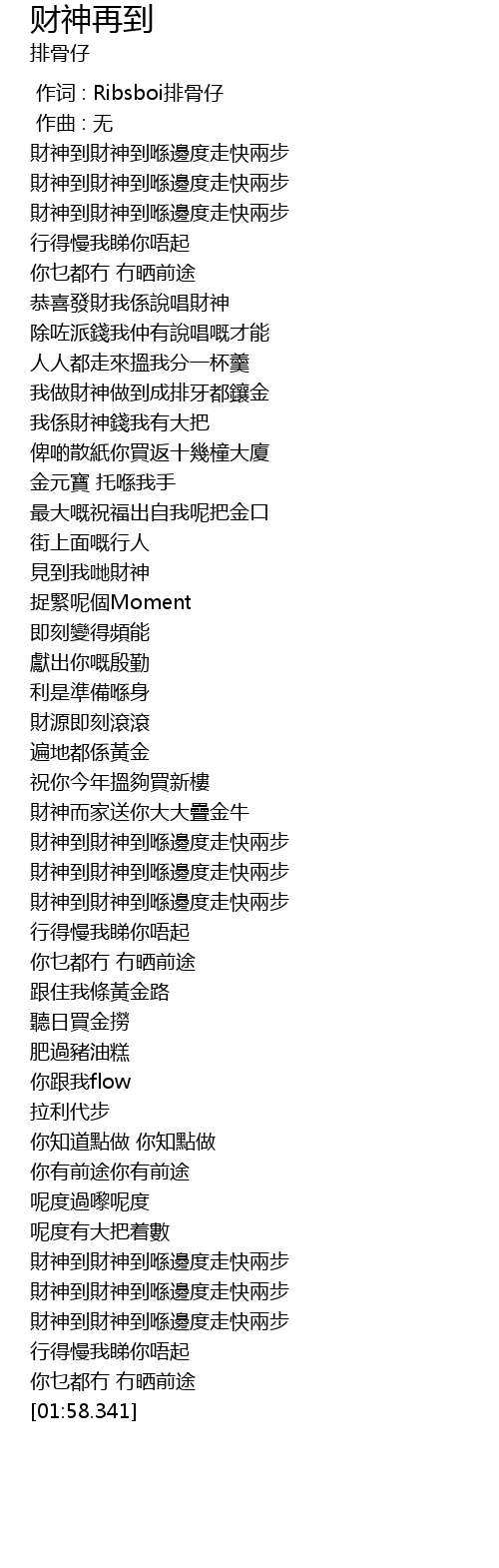 | [01:43.677] | 財神到財神到喺邊度走快兩步 |