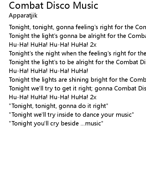 | Tonight, tonight, gonna feeling's right for the Combat Disco music, | |
