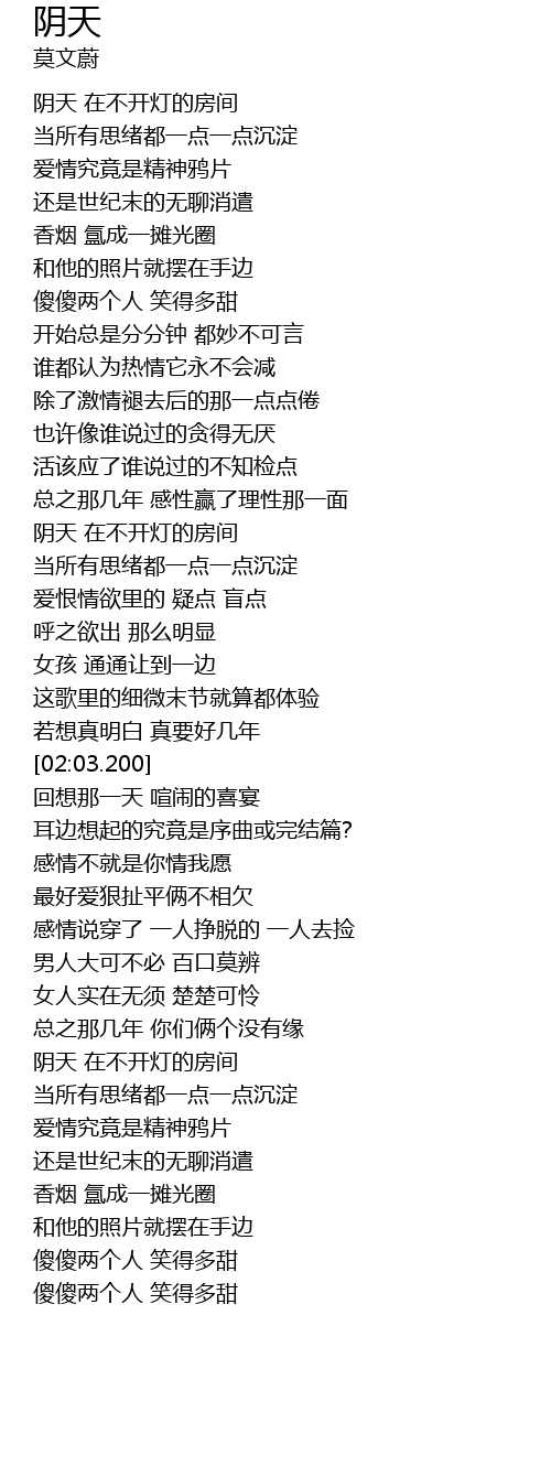 | [03:14.200] | 阴天 在不开灯的房间 |