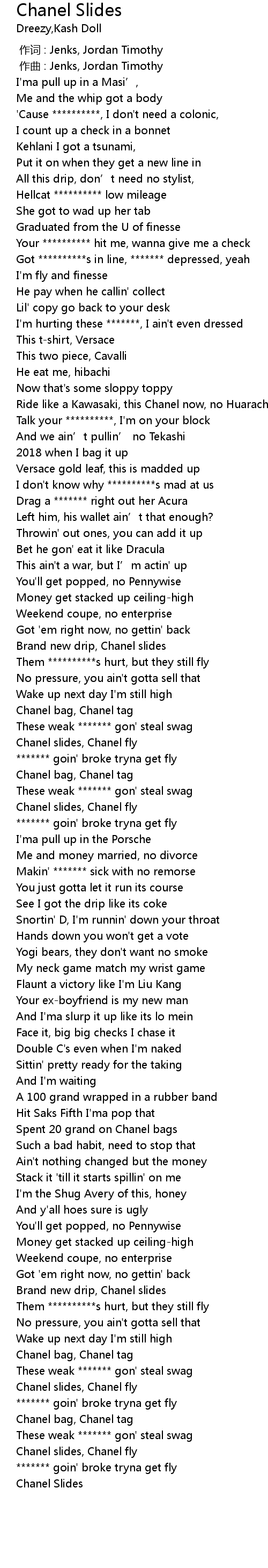 | [02:29.60] | Chanel slides, Chanel fly |