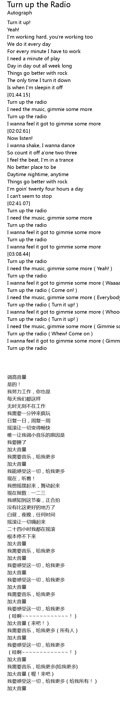 | [04:18.29] | Turn up the radio(Turn it up!) |
