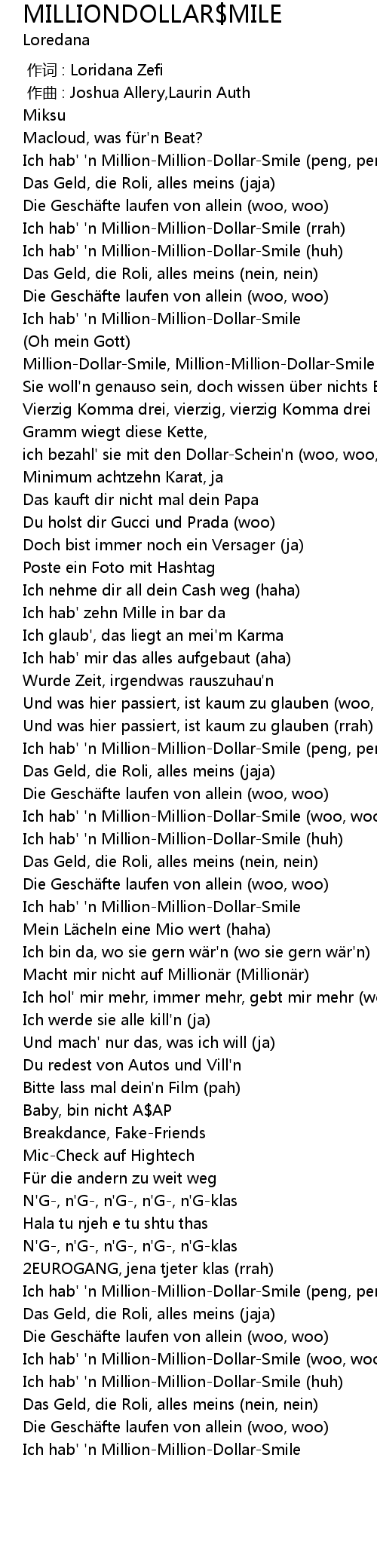 | [00:13.52] | Ich hab' 'n Million-Million-Dollar-Smile (peng, peng) |