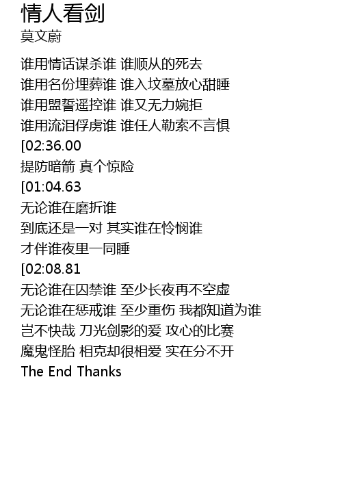 | [02:52.00][02:36.00][02:00.81][01:28.94][00:56.76] | 情人看剑 小心眼前 提防暗箭 真个惊险 |