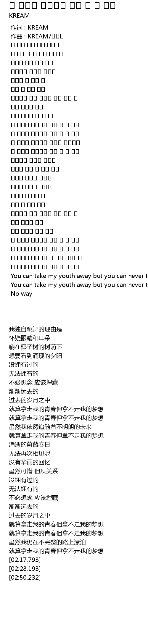| [02:17.793] | You can take my youth away but you can never take my dream away |