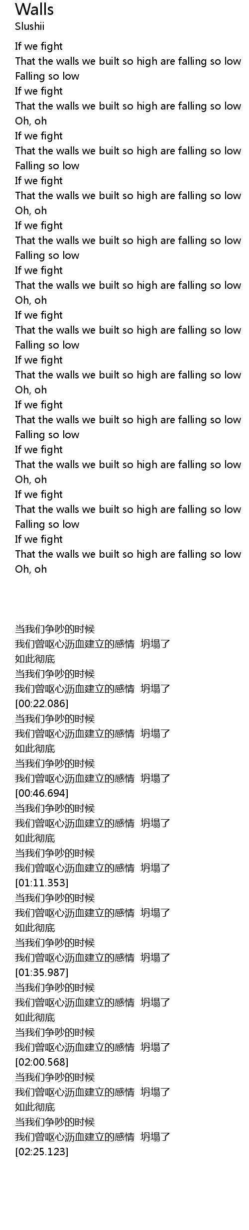 | [02:19.011] | That the walls we built so high are falling so low |