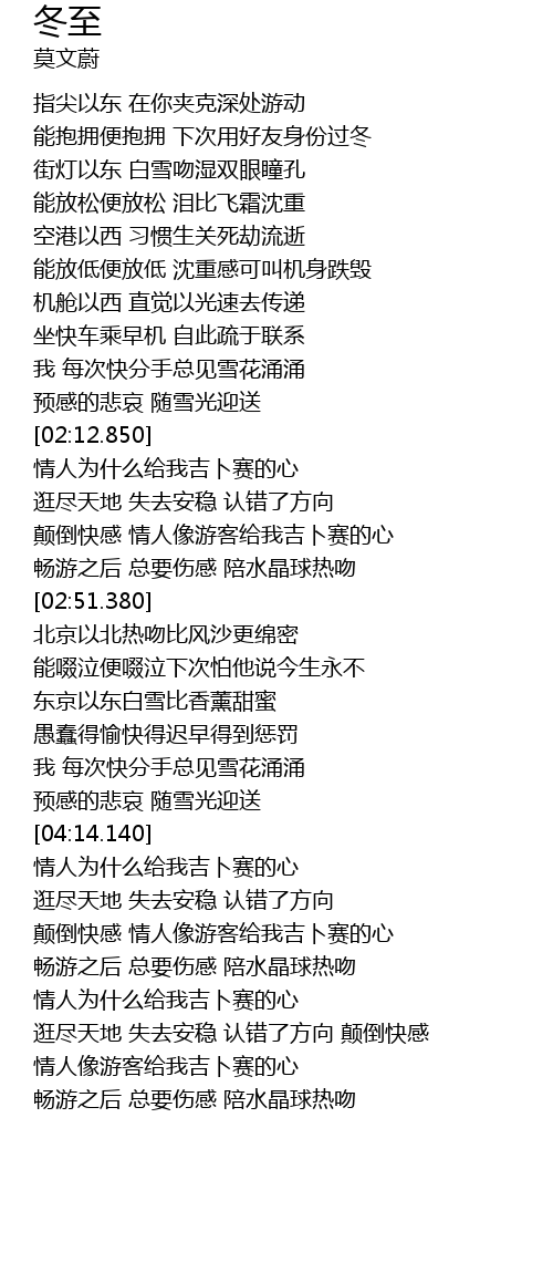 | [03:53.220] | 我 每次快分手总见雪花涌涌 |