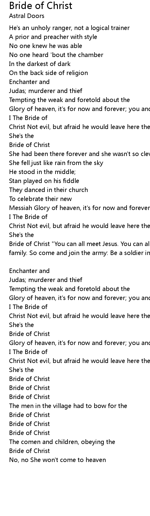 Bride of Christ "You can all meet Jesus. You can all be a part of his great big family. So come and join the army: Be a soldier in the name of God!" [Solo: Nordlund / Haglund] |