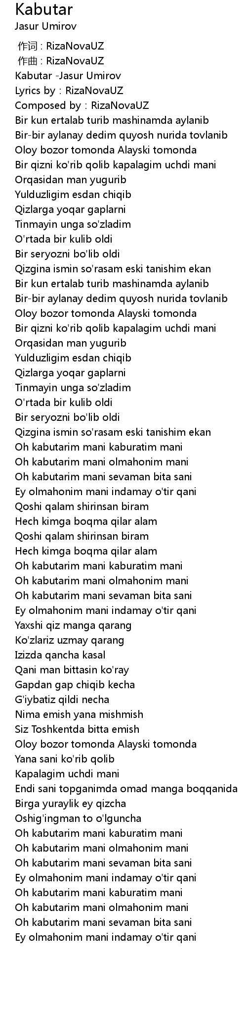 | [00:00.199] | Kabutar -Jasur Umirov |