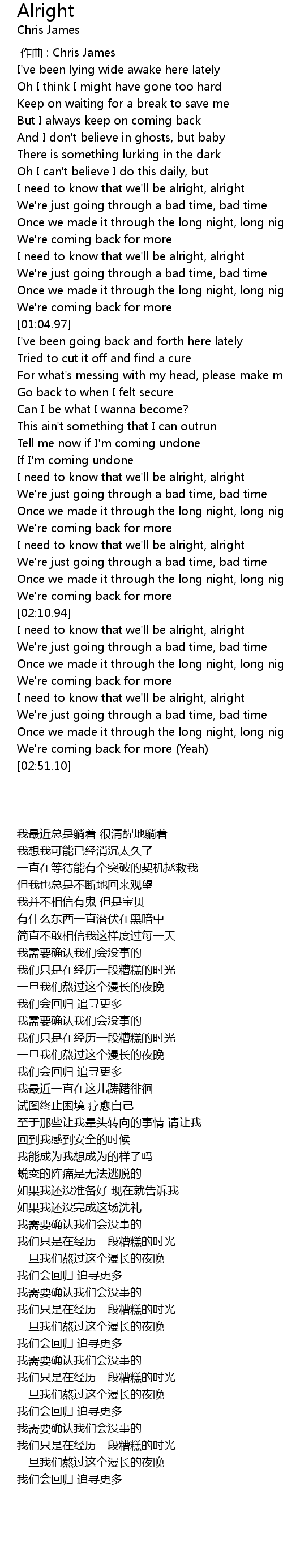 | [01:57.30] | I need to know that we'll be alright, alright |